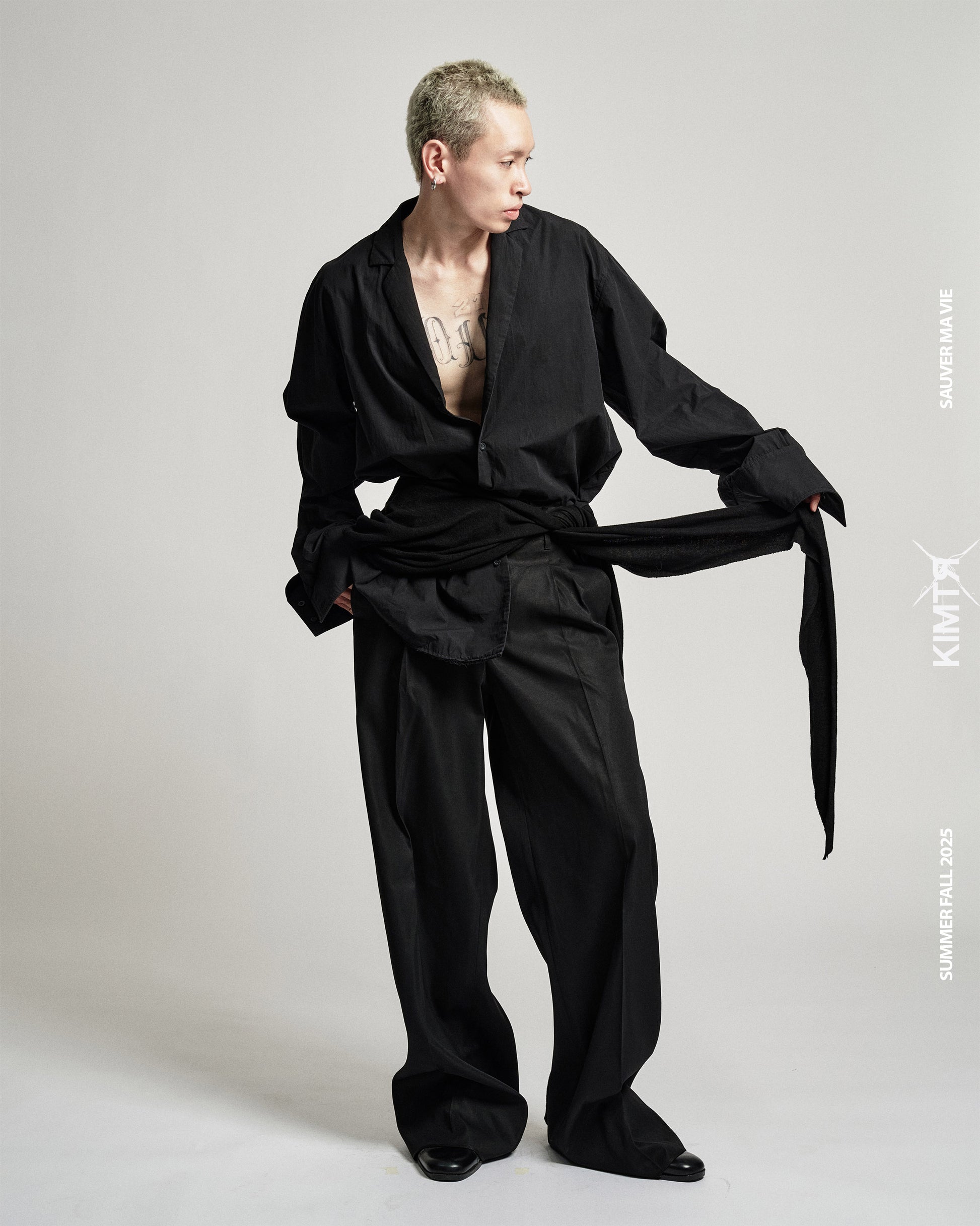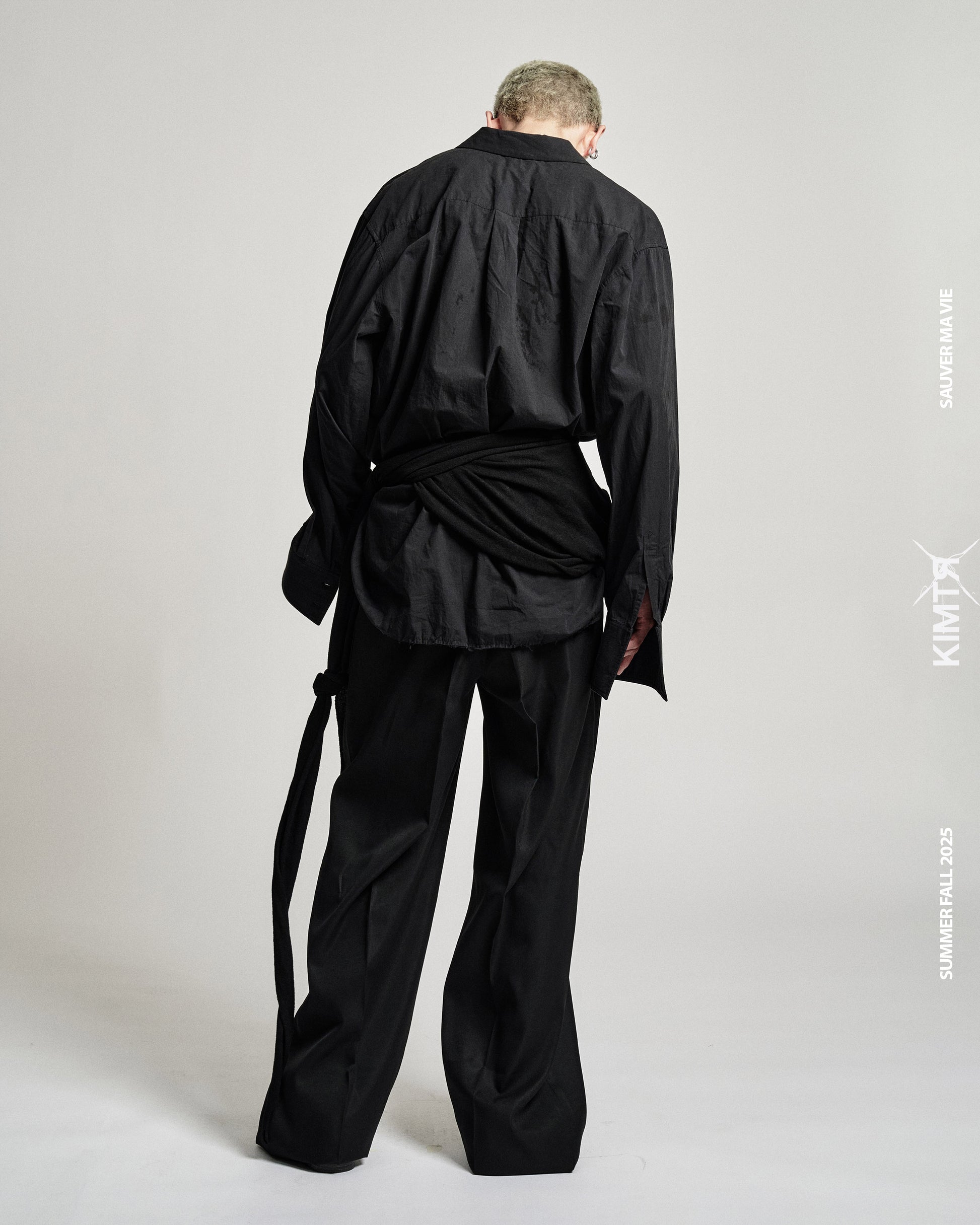 - Wide legs trousers with elongated passant worn as straps